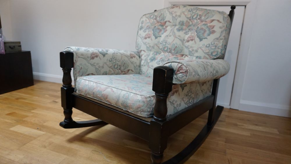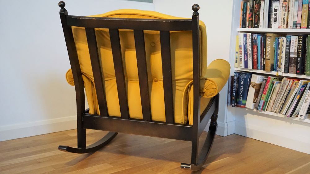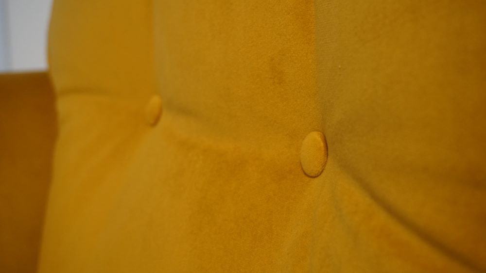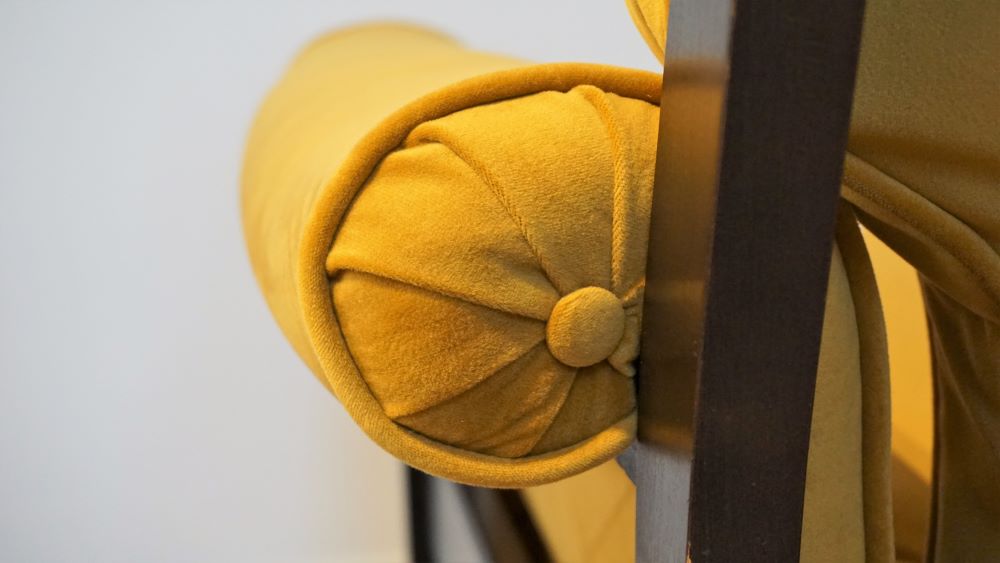 Warwick’s Plush Velvet in turmeric is used to contrast with the dark wood frame. The back cushion has buttons made in the same fabric. Adding buttons to the centre point of the arms provides the finishing touches.