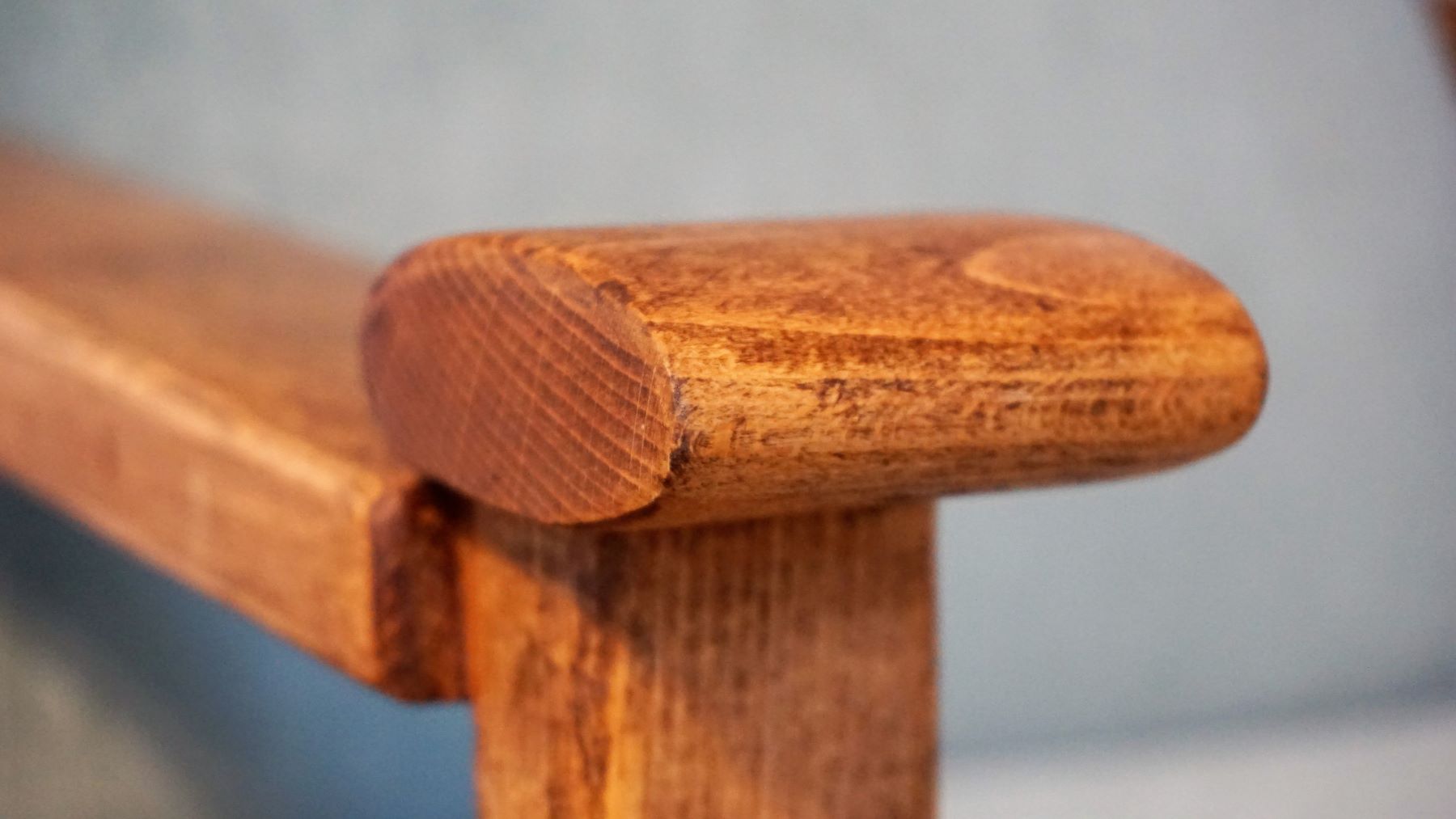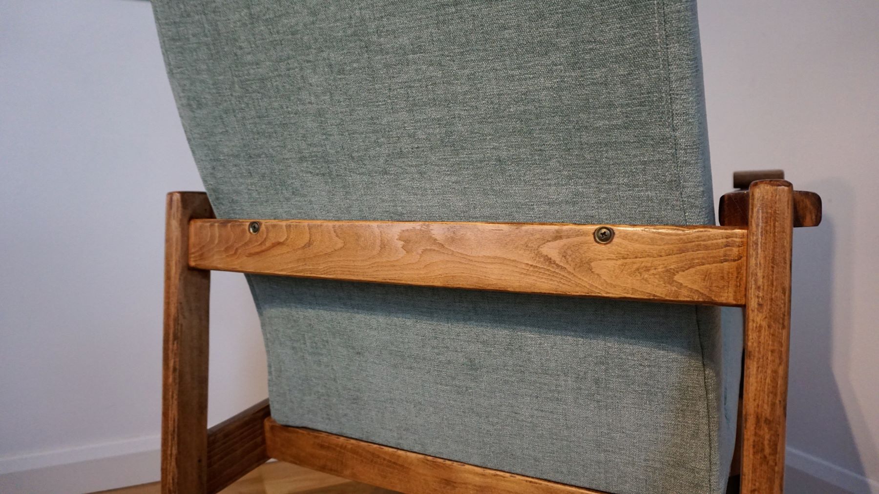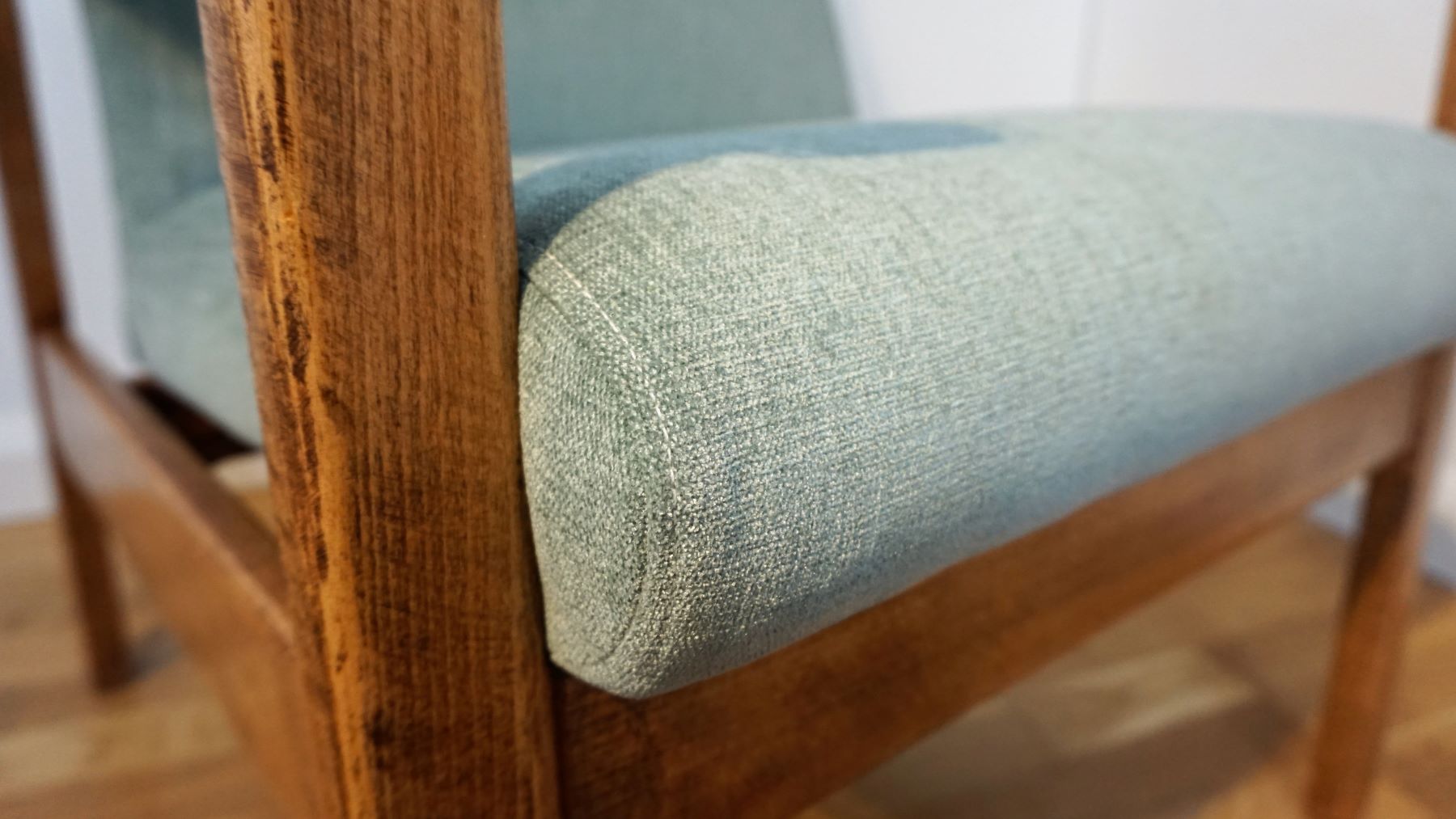 The chair needed to be stripped back and the perished foam replaced. It was covered in Warwick Rouen in Seaspray and finished with topstitching detail. The frame was sanded back to bare wood before being stained to a medium/light oak to complement the face fabric. Three layers of finishing oil and a good buff brought the wood back to life.