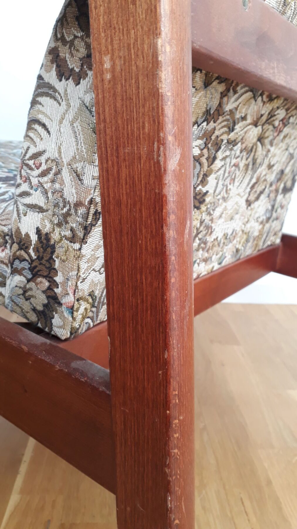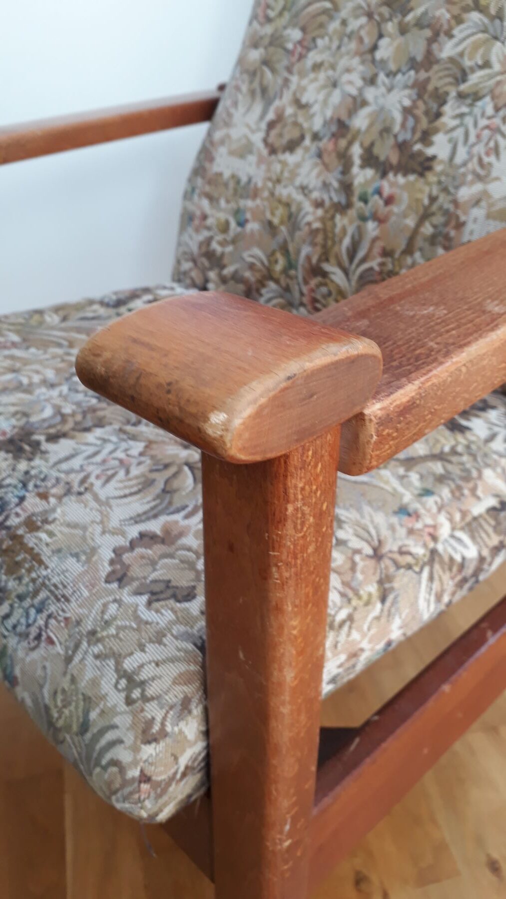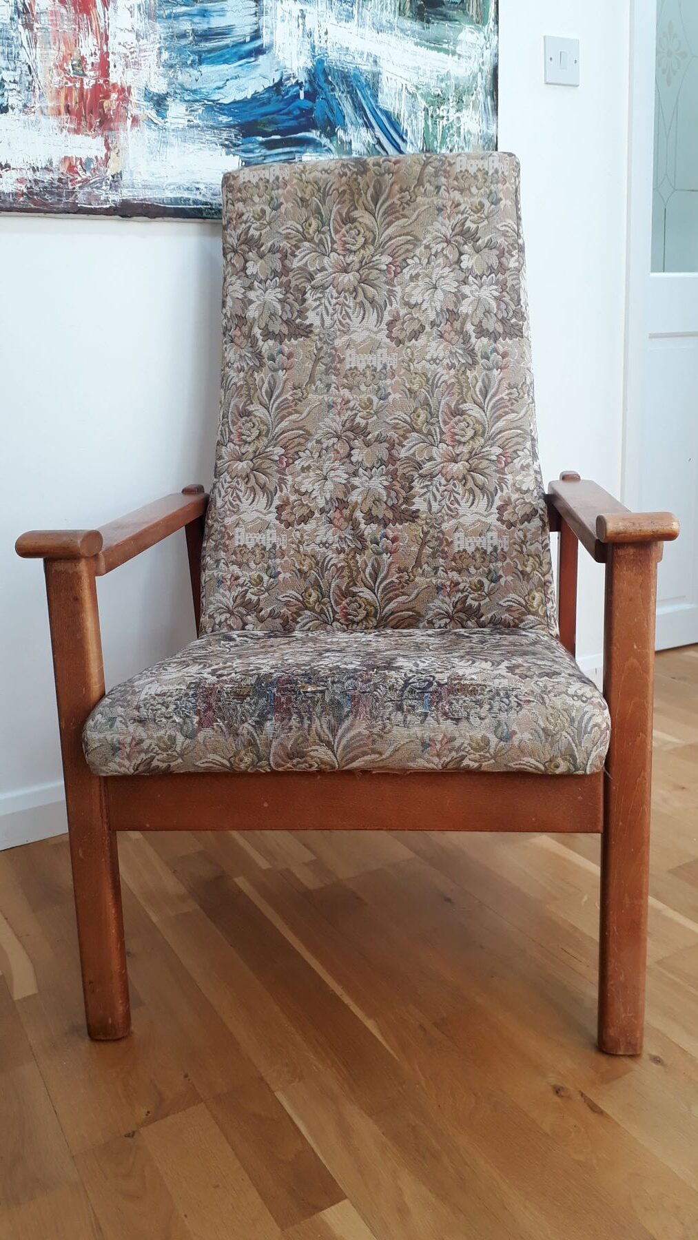 Sand out the knocks in the wood, improve the padding and recover the chair in new fabric.