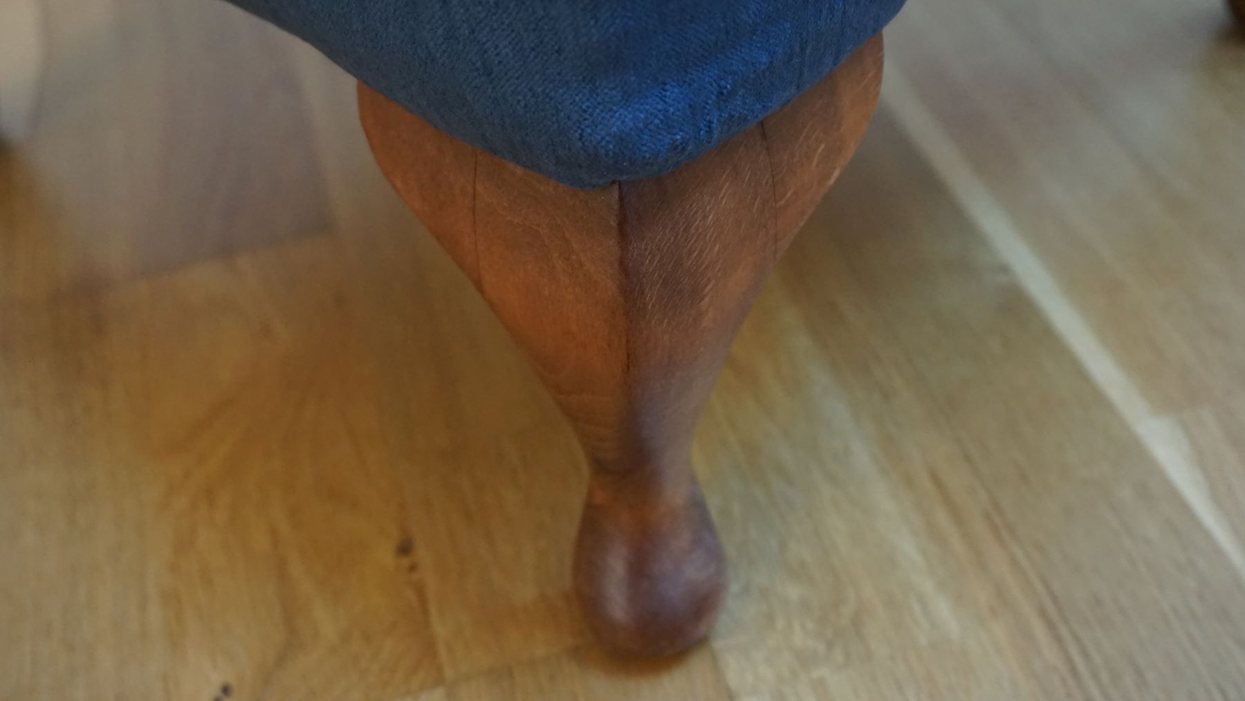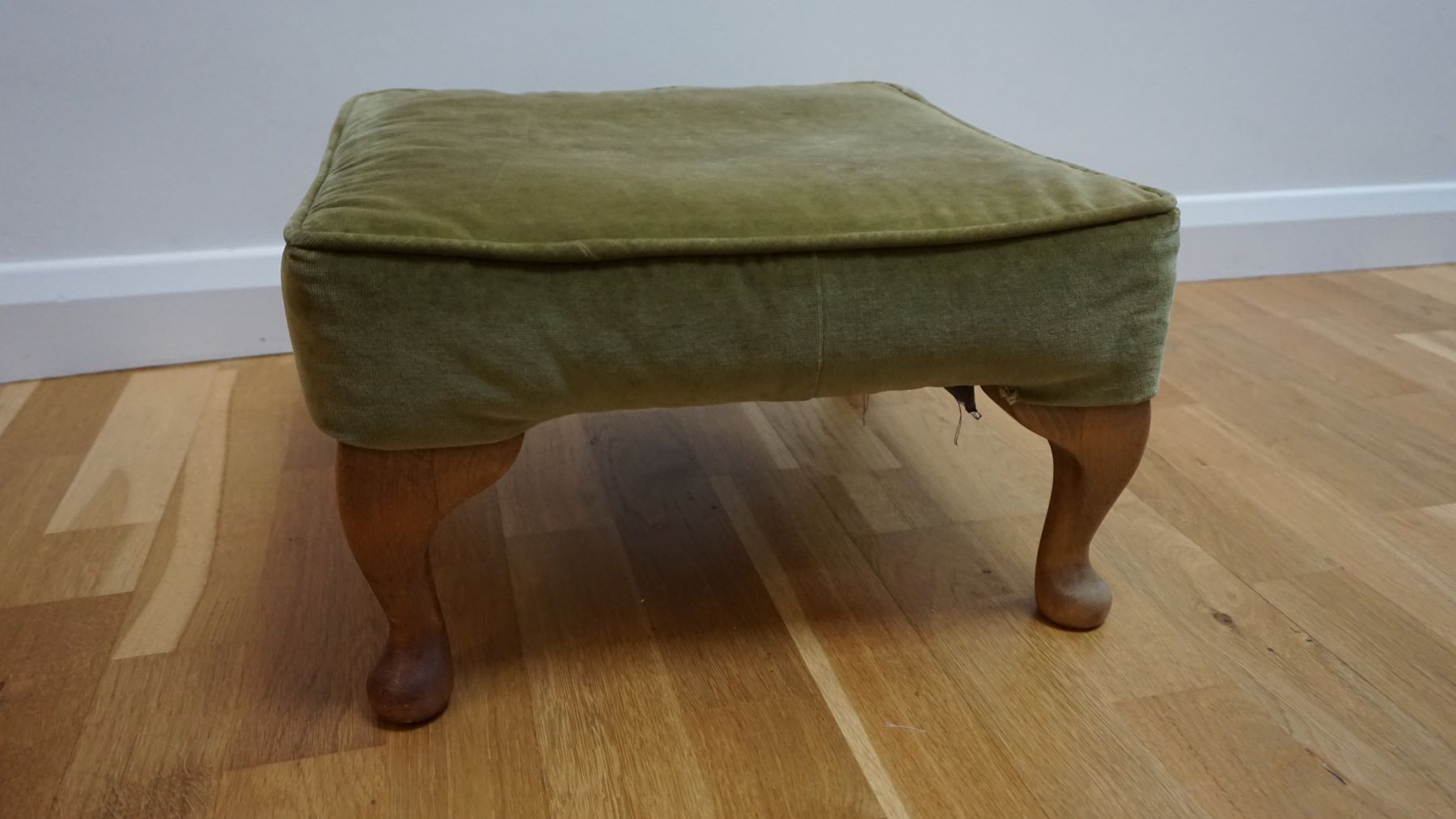 The footstool is traditionally upholstered using horsehair and a rolled edge. The padding is reconditioned and improved using traditional techniques and the frame is restored. A nourishing layer of oil for the legs, holes where tacks are removed filled with wood glue and sawdust. It is finally covered in the client’s own fabric.